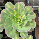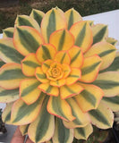 A partial reverse variegation of Aeonium sunburst. Bright yellow stripes run along each leaf, looking just like star lights bursting out from the center of the rosette. This plant loves full sun, when sun is strong leaf edge turns pink.