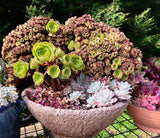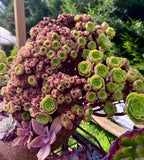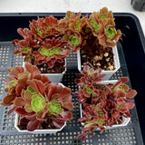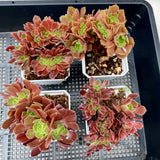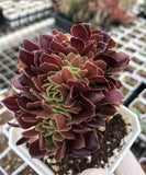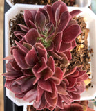 Aeonium blushing beauty is one of the most beautiful aeoniums. It has short and round leaves.  It usually has a green center and the outer leaves are more purple/red. Due the mutation, instead of growing into multiple rosettes, this crested plant grows fan-shaped stems. Prefers full/partial sun.