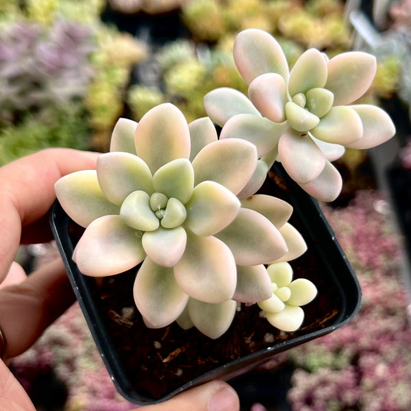 Graptopetalum 'Ellen' Variegated (also known as Graptopetalum Daruma Shu-rei variegata) is elegant and chunky. It has stable centre-variegation and leaves flushes into dusty pink and lavender. The edges are cream to soft yellow. It is easy to form clumps. Prefers full sun.