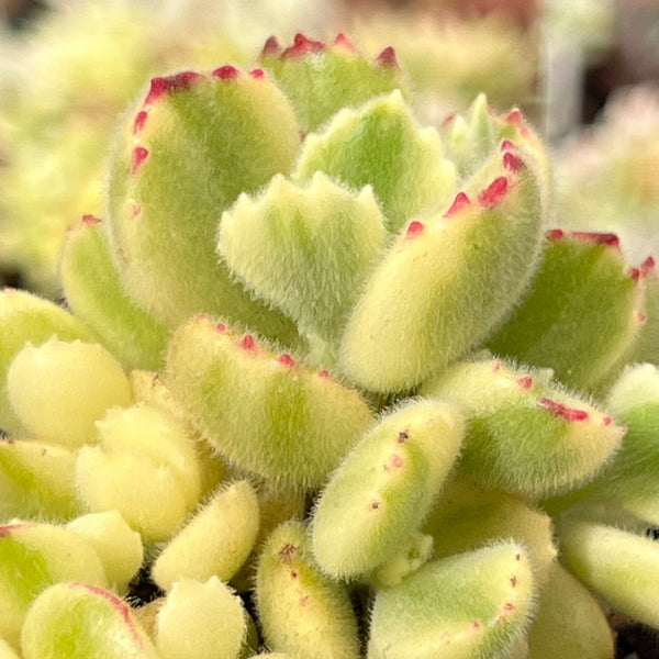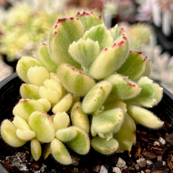 Cotyledon Ladismithiensis variegata white, also known as Cotyledon tomentosa variegata white, is a variegated form of the very popular Cotyledon tomentosa - green bear paws. Due to the variegation the leaves are green in the centre and white on the edges. It will have pink finger tips when sun is strong(photo 6) Prefers full/partial sun. Loves good ventilation.
