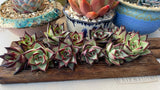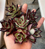 This is probably one of the most sought after Echeverias. When ebony is stressed the leaves will change to yellow and the purple/red edges will become very dark (almost black). Prefers full sun, E. ebony is a very strong and slow growing succulent. This batch comes from seed propagation so each one has slightly different shades of margin and leaves.