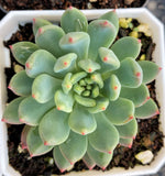 Sedeveria blue elf has blueish green leaves with red tips. This clustering succulent will first turn pink when stressed. If it is cold enough she will turn orange/red. Prefers full sun, easy to look after.